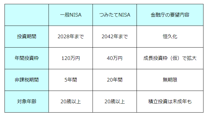 金融庁は2023年度の税制改正要望 で、少額投資非課税制度(NISA)の投資上限額の引き上げを盛り込む方針です。現行制度では、年間投資限度額120万円の「一般NISA」と、年間投資限度額40万円の「つみたてNISA」があります。また、投資期間の恒久化も求めているのです。現在の「一般NISA」と「つみたてNISA」の制度は、以下の通りです。