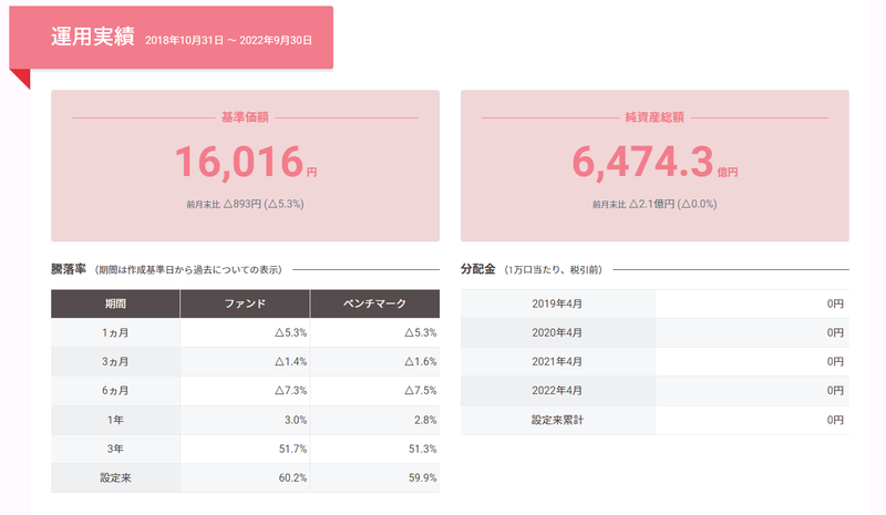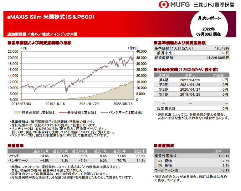 2022年のS&P500種株価指数は下落していますが、9月末時点における1年間騰落率は+9.4%となっています。同ファンドは円換算ベースのS&P500種株価指数を対象にしているので、円安・ドル高がプラスリターンに寄与しているからです。ただし、円高・ドル安になると為替差損がでるので注意が必要です。