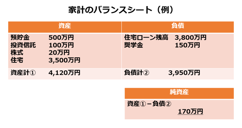 なお、投資信託や株式は現時点での評価額、住宅は売却した場合の市場価格を書きます。積み立てタイプの保険に加入している時は、解約金相当額が現在の資産です。例では、資産が4120万円ある一方で、負債が3950万円あります。もし今、資産をすべて現金化し、負債を返したら手残り(純資産)が170万円ということになります。