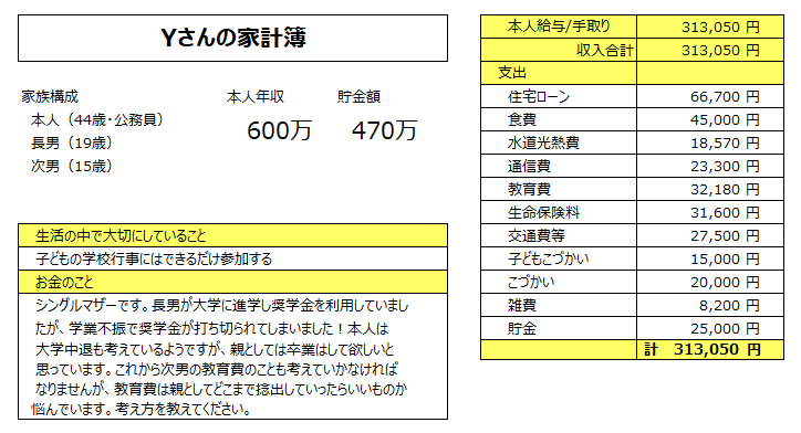 Yさんにとってお子さんの「教育費」は、子供の将来のために捻出したい③の「投資」として、今まで一生懸命お子さんのために工面されてきたと思います。親としてできるかぎり子供の応援をしてあげたいとお話いただきました。子供を応援しようと頑張ってきたのに奨学金打ち切りの連絡を受け、また、お子さんから中退の話などを聞くと目的を失うような気持ちになったかもしれません。