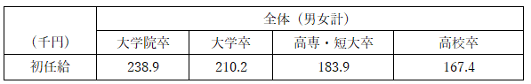 現在はどうでしょうか。「令和元年賃金構造基本統計調査結果(初任給)の概況(厚生労働省)」によると金融業・保険業(大学卒)の平均初任給は20万7300円となっています。20年以上経過していますが、わずか2000円程度の違いにとどまっています。全産業の初任給平均は下の図表1を見てください。