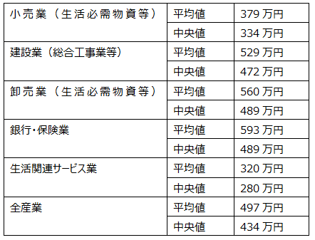 また仕事の内容、業種も給与に影響します。以下は全産業と一部の産業別の年収の平均値と中央値です。中央値の方がより実態に則していると思います。
