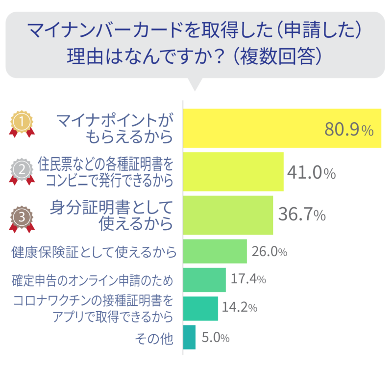最も多かった回答は「マイナポイントがもらえるから」。マイナポイント事業が、マイナンバーカード取得に大きく影響していることが分かりました。