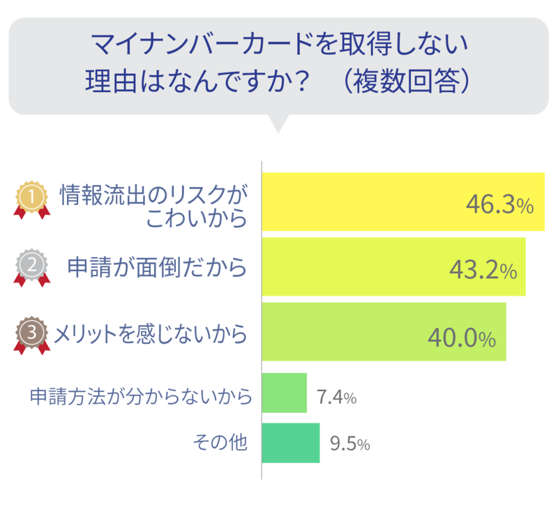「情報流出のリスクが怖いから」が最も多く、次いで「申請が面倒だから」、「メリットを感じないから」の順になりました。