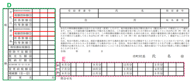 この所得控除を差し引きしたのがC欄の「課税標準」です。これに税率を掛けるなどで計算された住民税の内訳がD欄「税額」となり、市町村と道府県に分けて記載されます。決定した住民税は、E欄にあるように、6月~翌年5月の間で12分割して給与から天引きされ納めます。