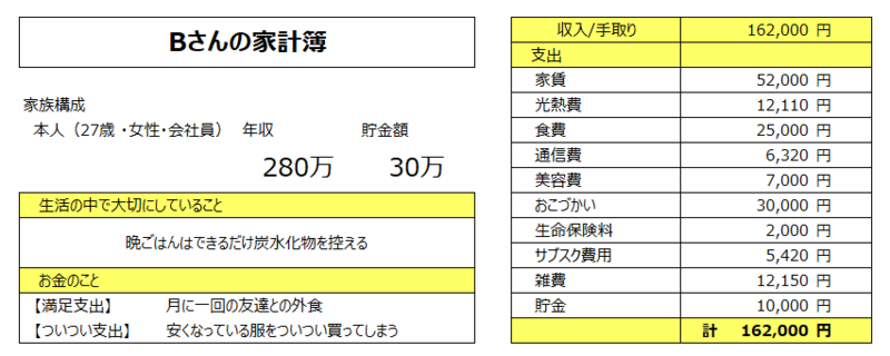 Bさんの満足支出が「月に1回の友達との外食」とのことですが、その外食分の予算も立て、支出の項目として予算をとってみてください。その満足支出を継続して支出できる家計にするため見直せる項目がないか確認しましょう。