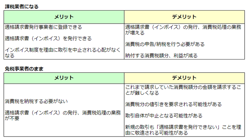 免税事業者・課税事業者(インボイス登録事業者)、それぞれの主なメリットとデメリットを比較してみましょう。