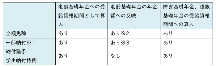 国民年金保険料の「免除」が適用された場合は、老齢基礎年金への受給資格期間として算入され老齢基礎年金額へも一定額が反映されます。「納付猶予」「学生納付特例」が適用された場合は、受給資格期間への算入はあるものの、年金額への反映はないことに注意が必要です。