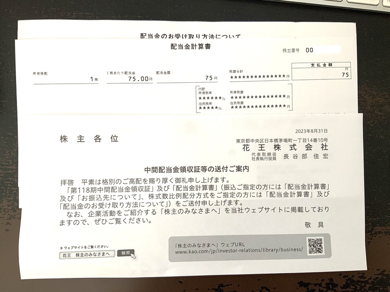 8月末には配当金も入りました。1株分75円。確かに小銭、でもしっかりと心があったかくなりました。数日後には封書で「株式関係重要書類」が届きました。配当金領収証などが入っています。(参考:書類画像)