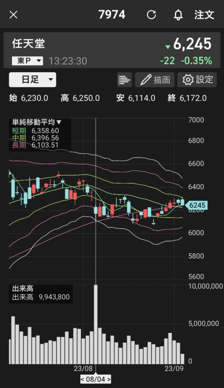 ただ、最近見ている天下の任天堂<7974>。8月上旬は「好決算の後の謎の安値」があり、これは買いでは!?と思いつつも、あまりに知識がないので様子見しておりました。結果、9月上旬までの1カ月、それほど上がることなく、なんならまだ下がったりもしていて、やはり難しいなあというのが印象です。(参考:チャート画像)