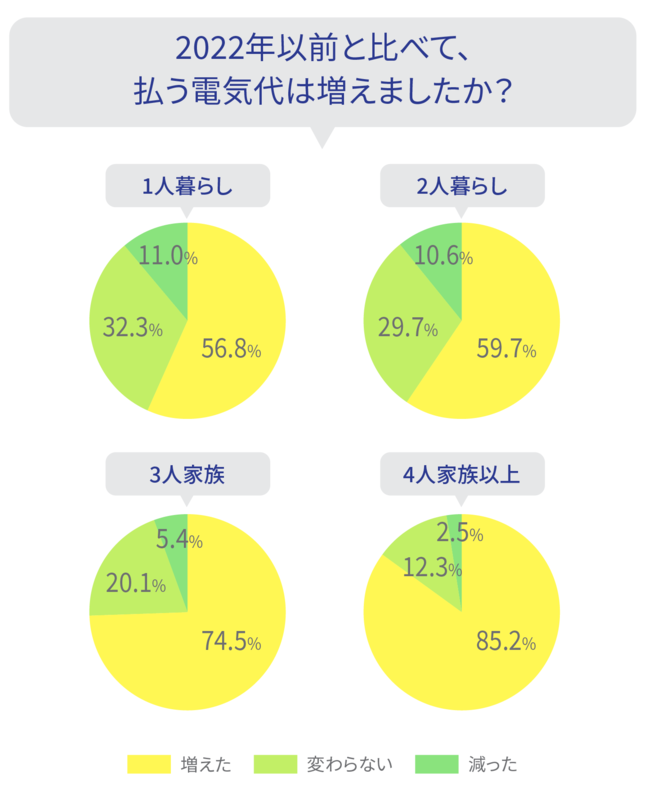 今回の調査では、世帯人数が多いほど電気代が高く、去年よりも今年は電気代が高くなっていることをみなさん実感していました。