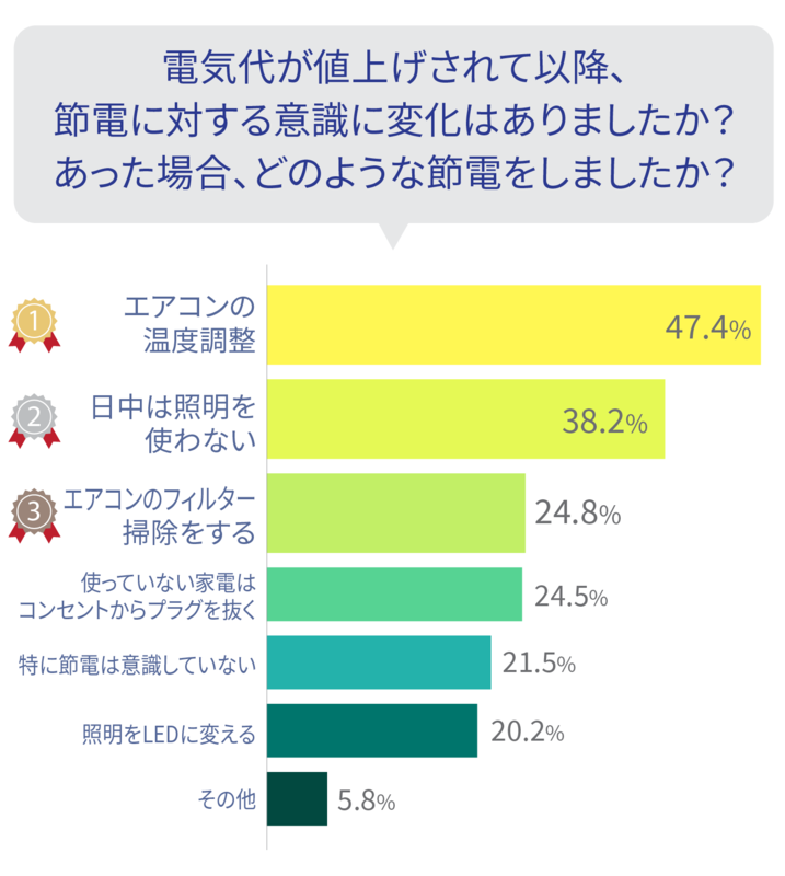 次いで、「日中は照明を使わない」、「エアコンのフィルターを掃除する」、「使っていない家電はコンセントからプラグを抜く」という順になりました。