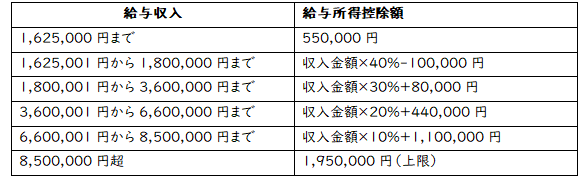 いわゆる額面の年収から以下の表1で計算される給与所得控除を差し引きます。自営業の人などは必要経費を計上するため、かかった費用の領収書を全部揃え、確定申告を行います。この「自営業の必要経費」と同じような位置づけなのが、給与所得控除です。少なくとも55万円、最大195万円を控除することができます。