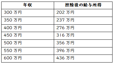 以下、表2は年収300~600万円の給与収入から給与所得控除を差し引いた「給与所得」の金額をまとめた早見表です。