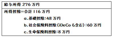 a~cを合わせると116万円となりました。よって給与所得の276万円からこの金額を差し引くと課税所得が分かります。