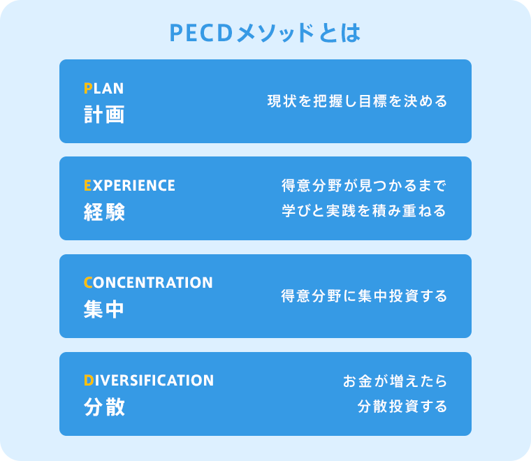 そうだね。そしてここで僕が提案したいのが、「PECDメソッド」という、ファイナンシャルアカデミーオリジナルの資産形成メソッドなんだ。