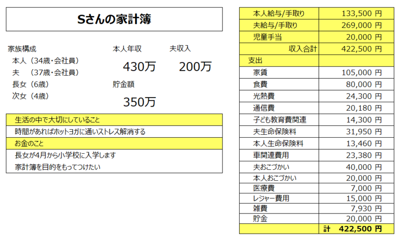Sさんの家計簿を見ると、貯金は児童手当分の2万円のみとなっています。ご夫婦の給与収入からはまったく貯金ができていないことになります。一般に、手取りの15%程度が無理のない貯金の割合と言われます。手取り40万2500円の15%は、約6万円です。しかし、今はお子さまが小さくお金を貯めやすい時期ですので、6万円以上の貯金を検討してみることをおすすめします。