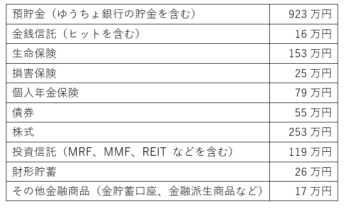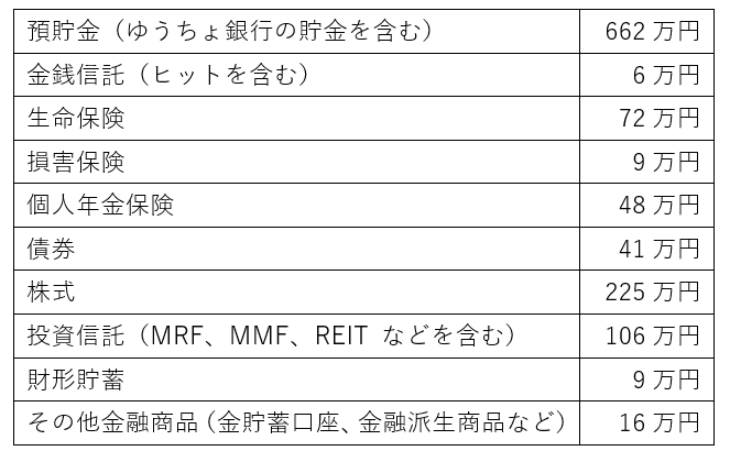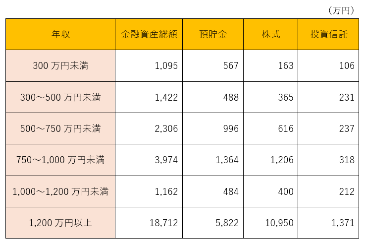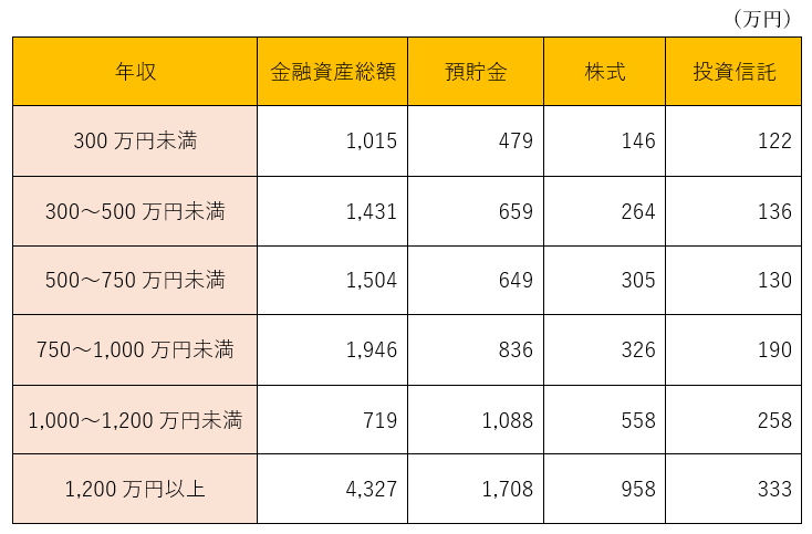 では金融資産を有している人を対象に、具体的にどのような資産をどのくらい有しているのでしょうか?預貯金と株式、投資信託について見てみましょう。