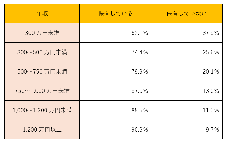 年収300万円未満の場合、4割近い世帯が金融資産を有していないと回答しています。やはり年収が高くなればなるほど金融資産を保有している人の割合が増える傾向にあります。