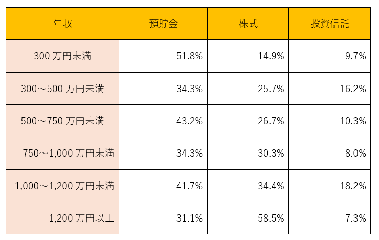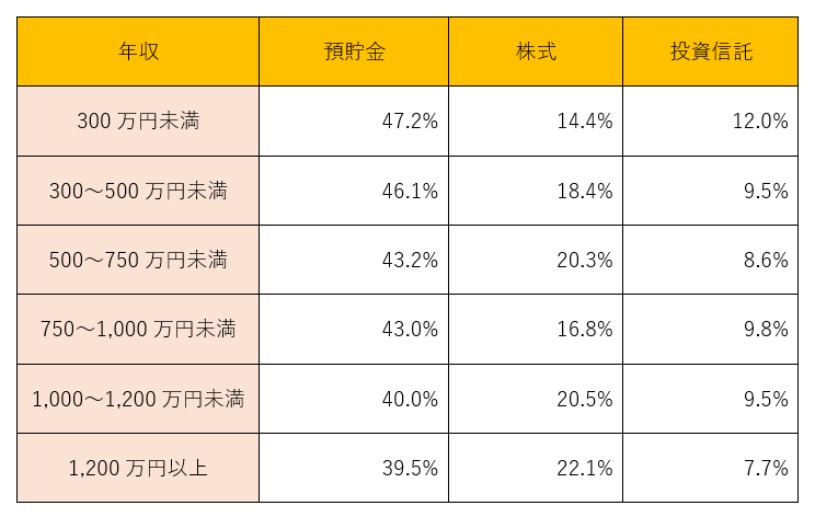 年収によって多少の差はみられますが、概ね、預貯金が資産全体の4~5割程度を占め、株式や投資信託といったリスク資産は3割前後というのが一般的のようです。