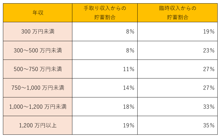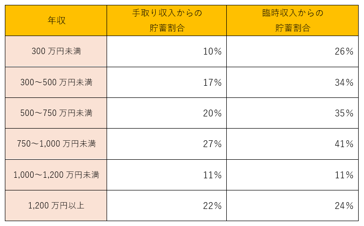 手取り収入からの貯蓄割合、臨時収入からの貯蓄割合について紹介します。
