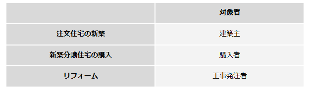 また、上記のうち「注文住宅の新築」と「新築分譲住宅の購入」は子育て世帯もしくは若者夫婦世帯が取得する場合に限られており、それぞれの条件は次のようになっています。(リフォームの場合は子どもの有無や年齢制限なし)