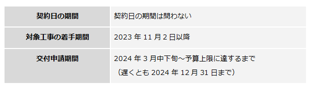 交付申請は2024年3月中下旬から2024年12月31日までとなっている一方、予算の上限に達した場合は、締め切られる可能性があります。そのため、申請を検討している場合はなるべく早めに申請を済ませるとよいでしょう。
