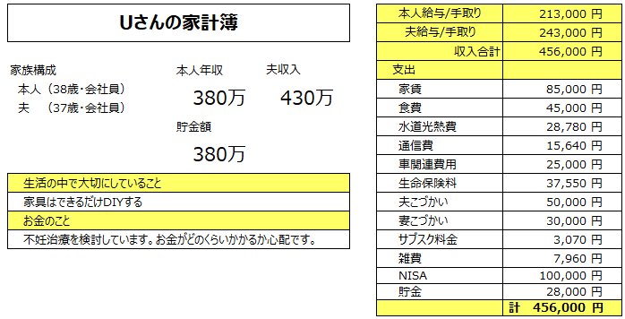 FPオフィス「フォルテシモ」へ依頼されたお客さまの家計簿を、mymoで診断する【うちの家計簿】。今回は38歳会社員女性のUさん。不妊治療を検討しているという共働きご夫婦の家計簿です。