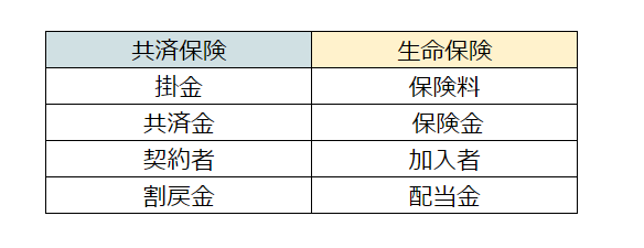 また、生命保険は金融庁が監督官庁ですが、都道府県民共済、こくみん共済co-op、コープ共済連は厚生労働省、JA共済は農林水産省が監督しています。用いる言葉も、以下のように異なります。