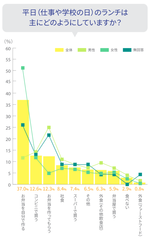 今回の調査では、平日のランチは「お弁当を自分で作る」と答えた方が37.0%と、最も多くなりました。