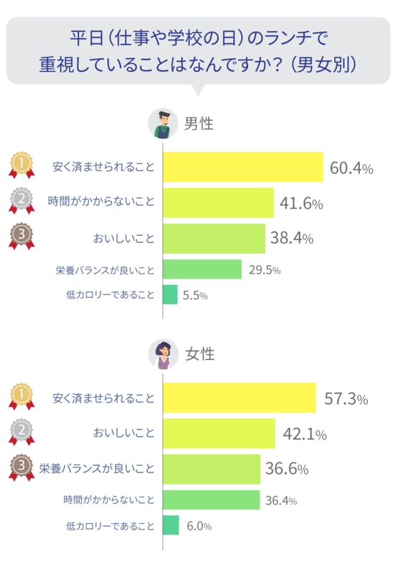 男性は「時間がかからないこと」を重視しており、女性は節約しながらもおいしいランチを求めているという違いも見えてきました。