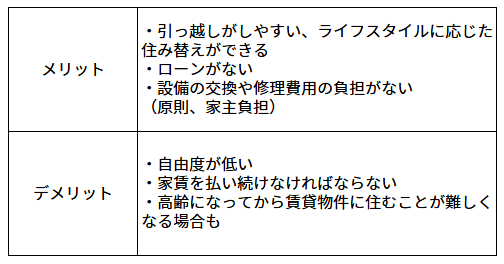 賃貸は、維持費など費用面がメリットとなりそうです。一方、近年よく取り上げられる「孤独死」などの問題もあり、高齢者に物件を貸したくないという家主も増えています。老後、住み替えなどをする際にデメリットとなる可能性も踏まえておきたいところです。