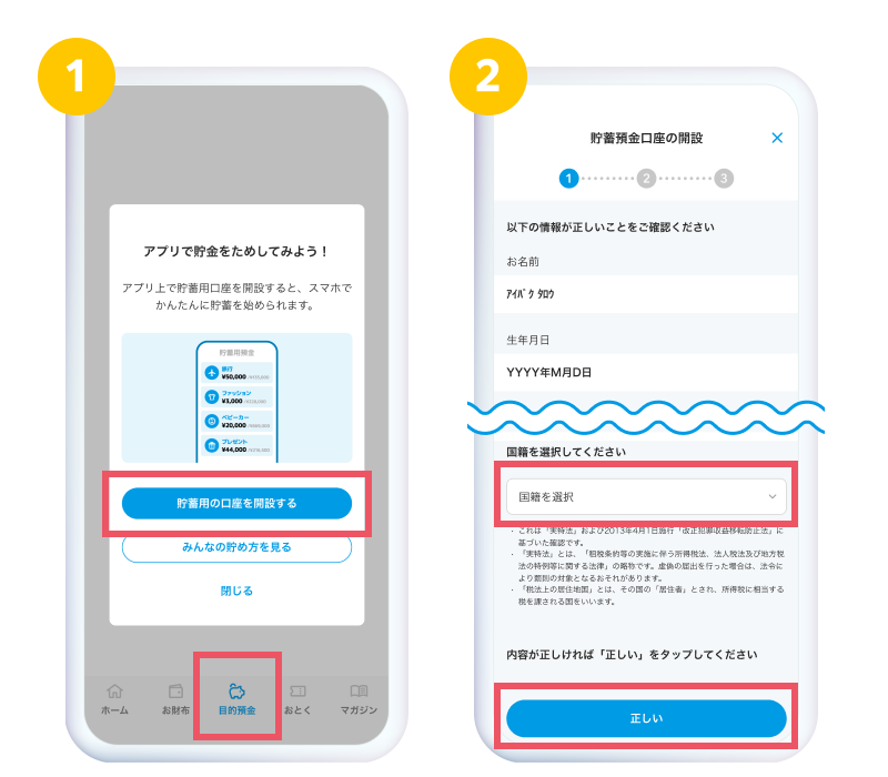 1.「目的預金」メニューをタップし、「貯蓄用の口座を開設する」をタップ