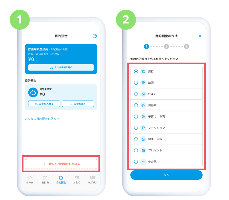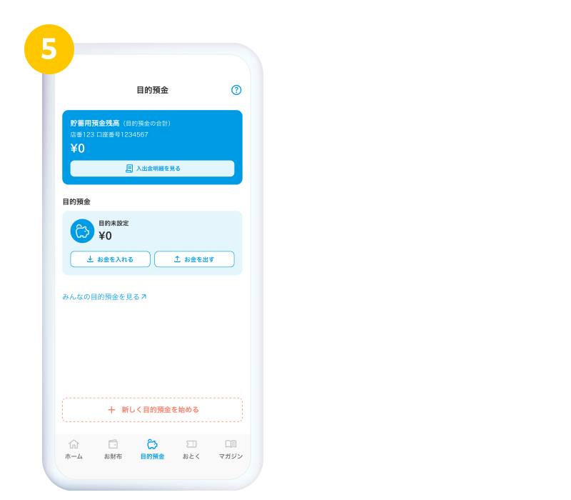 貯蓄用口座の開設が完了したら、次は目的預金を作成してみましょう。