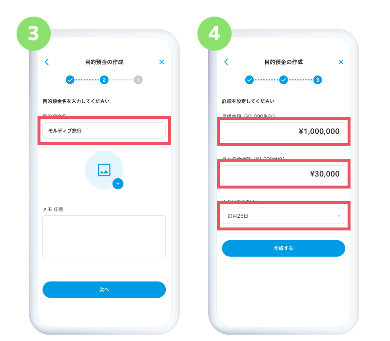4.目標金額・月々の預金額を入力し、入金日を選択後、「作成する」をタップ