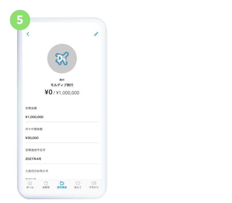 目的預金とは、Wallet+のアプリ内で目的ごとに貯蓄できる機能です。