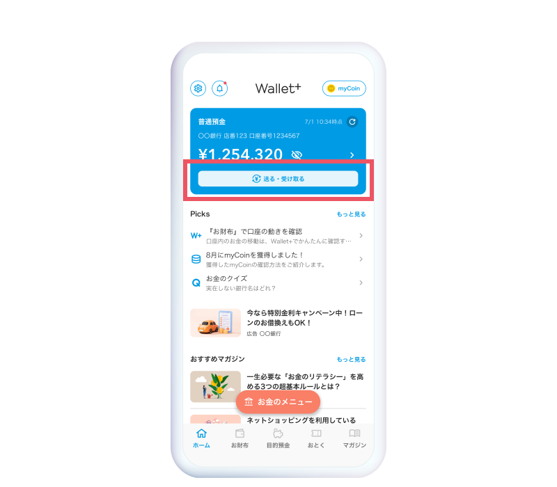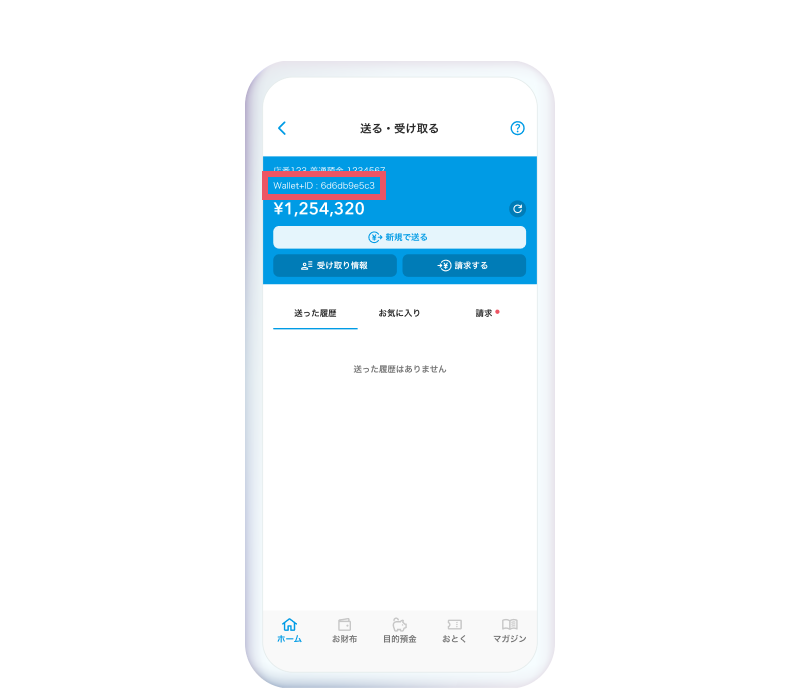 なお、「送る・受け取る」を利用するには、事前に利用登録が必要です。利用登録がお済みでない方は、Wallet+アプリを起動し、ホーム画面の残高下の「送る・受け取る」メニューボタンをタップして利用登録をしてください。