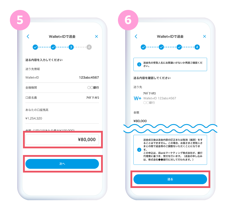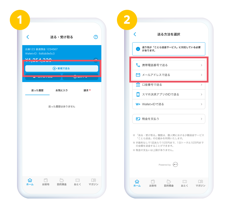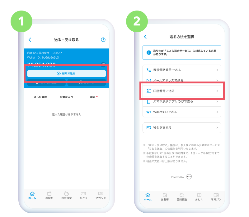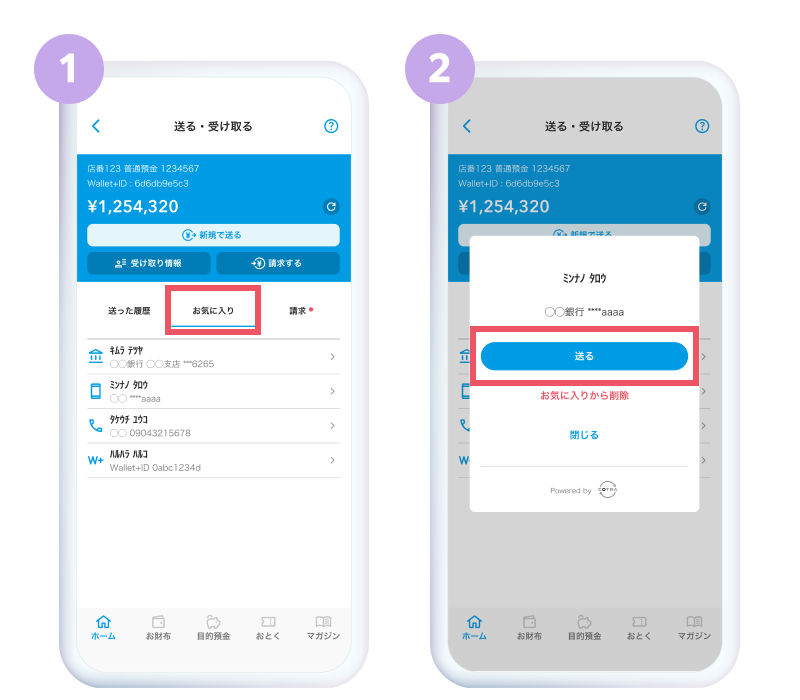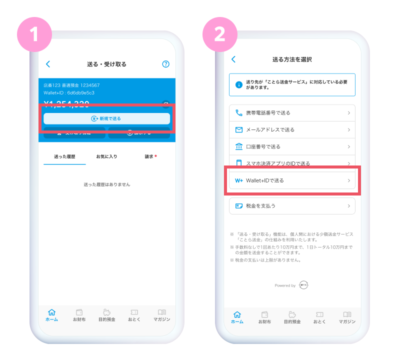 ※Wallet+IDは阿波銀行、北日本銀行、熊本銀行、佐賀銀行、十八親和銀行、福岡銀行の普通預金口座を登録かつ、「送る・受け取る」の利用登録をしているWallet+ユーザーに送金することができます。
