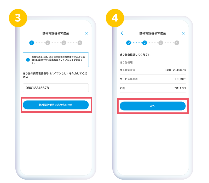 3.携帯電話番号またはメールアドレスを入力して送り先を検索