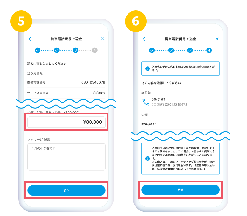 ※携帯電話番号・メールアドレスについて、送り先側で受け取り口座に携帯電話番号またはメールアドレスを紐づけ登録している場合に送金ができます。