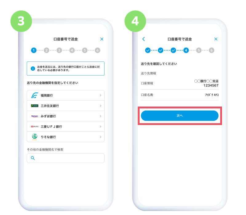 3.送り先の銀行・支店・口座番号を順に入力し、送り先を検索
