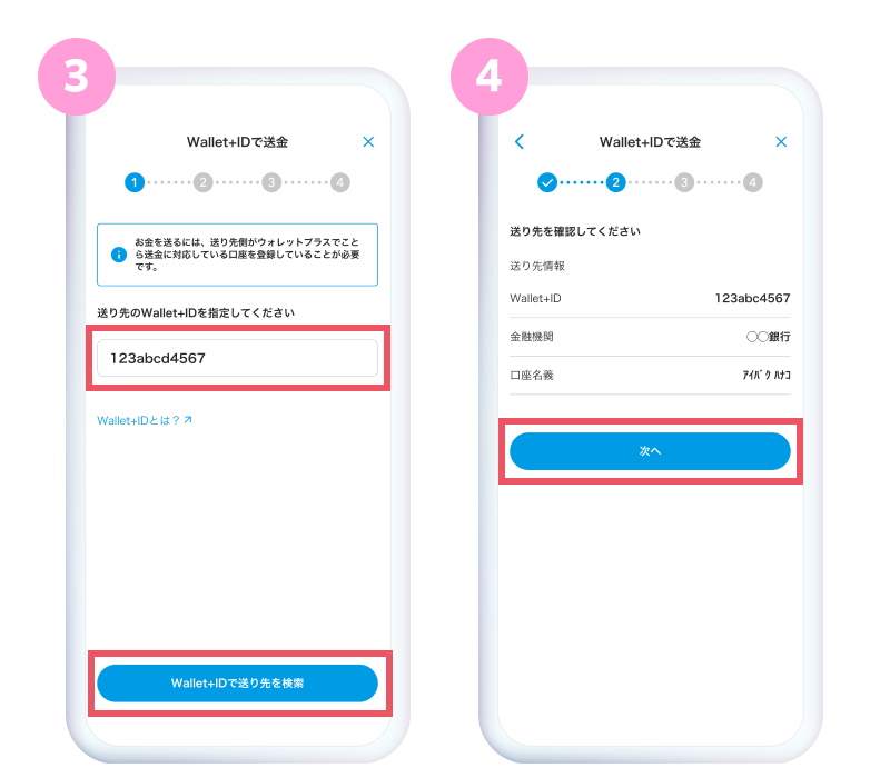 3.送りたい相手のWallet+IDを入力し、送り先を検索