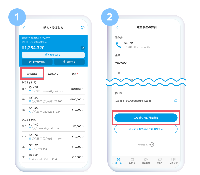 「送った履歴」から、再度同じ相手へ送金することも可能です。