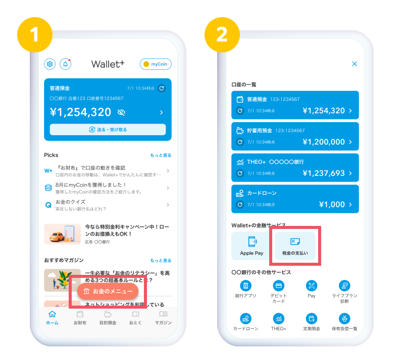 なお、「税金の支払い」機能を利用するには、事前に利用登録が必要です。利用登録がお済みでない方はWallet+アプリを起動し、ホーム画面の「お金のメニュー」内の「税金の支払い」ボタンをタップして利用登録をしてください。