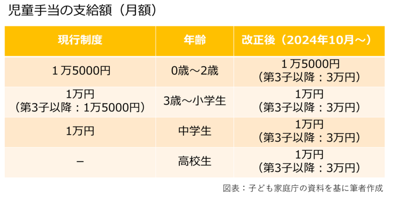 児童手当の支給額は生まれてから2歳まで月1万5000円、その後は中学生まで月1万円が原則でした。また、第3子以降の子供に対する支給額は「多子加算」という特例があり、生まれてから小学校まで1万5000円と手厚く、中学生になると原則通り1万円の給付となっていました。改正後は高校生にも月1万円が支給され、第3子への加算は生まれてから高校生までずっと月3万円となります。特に多子加算の改正は目を引き、政策の意図が読み取れます。
