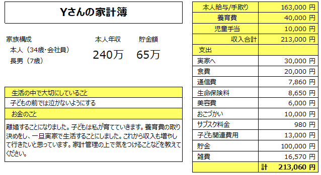 今月は収入の約半分の月10万円を貯金できたとのことです。児童扶養手当は所得によって金額が変わります。児童扶養手当の所得額には、養育費の8割が加算されるため、養育費の金額や今後のYさんの収入によっては児童扶養手当の受給額が減額されたり、支給停止になったりすることもあります。