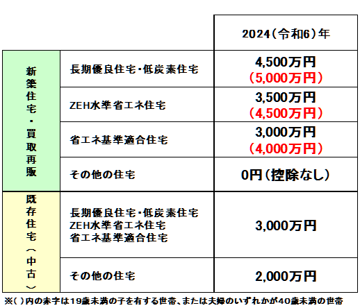 また2024年からは、新築で省エネルギー基準を満たしていない住宅は控除が受けられなくなっています。なお省エネルギー基準を満たしていなくても、2023年12月31日までに 新築確認をした場合は2000万円までが上限となります。また中古住宅であれば省エネルギー基準を満たしていなくても控除の適用対象です。