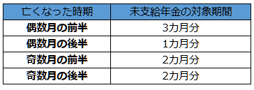 年金は受給権者が亡くなった月の分まで支給されます。偶数月に亡くなった場合は3カ月か1カ月、奇数月に亡くなった場合は月の前半・後半に関わらず2カ月分の未支給年金が発生します。