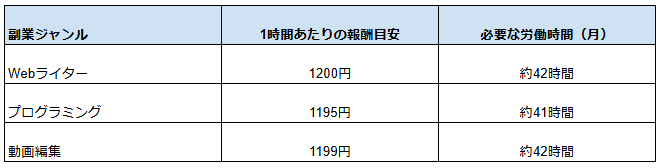 副業で月5万円の収入を得るにはどれくらい働く必要があるのでしょう?ここではランキング上位の3つを見ていきます。通常「1本いくら」で計算することが多いのですが、分かりやすいよう時給に換算してみました。