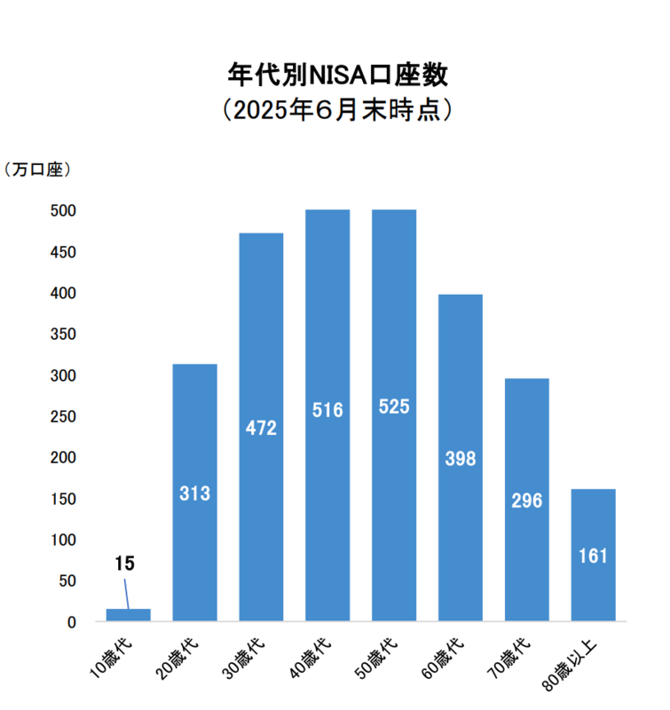 ご質問の「今、定期預金とNISAのどちらに預ける人が多いか」についてですが、2024年の新NISA開始以降、NISA口座の開設者数は爆発的に増加しています。日本証券業協会の発表では、2025年6月末現在のNISA口座は全金融機関を合計すると2696万口座になっています。また年代別NISA口座数では50代で525万口座におよび、全年代の中でもトップを占めます。